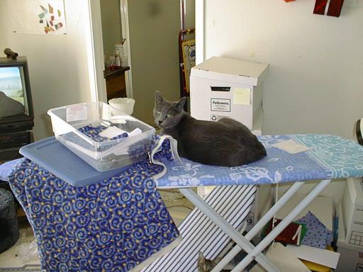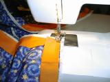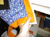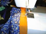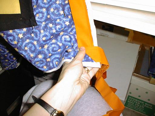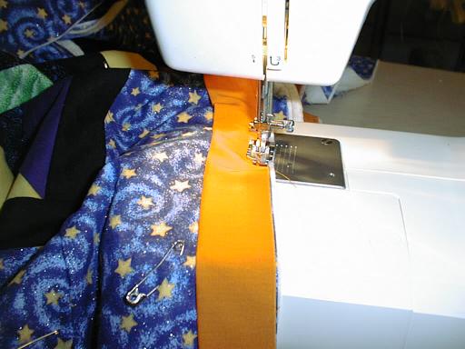 | After ironing the binding, I'm attaching it. The orange was a spur of the moment decision, like the rest of the quilt, but it all came together really well!