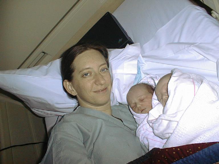 | Kimberly had Zafina, and the attending doc was in checking out Liam when he got paged. Since Amy was in the restroom, he handed me (Kimberly) Liam too! Amy let me snuggle with them both for a heavenly half hour or more while she visited with Kalinda!